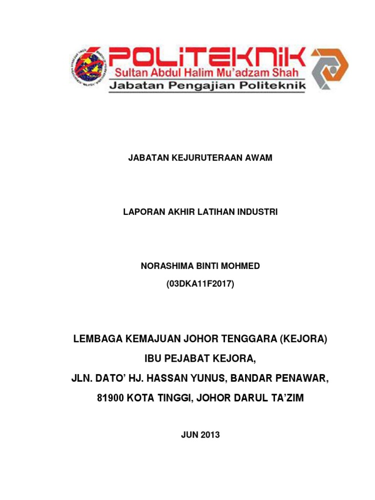 . Contoh laporan latihan industri 2019. A short summary of this paper. MAJLIS BANDARAYA IPOH JABATAN KEJURUTERAAN JALAN SULTAN ABDUL JALIL 30450 IPOH PERAK DARUL RIDZUAN NOR AQILAH BINTI ABDUL HAMID 01DKA15F2004 JABATAN KEJURUTERAAN AWAM 2 JULAI 16 NOVEMBER 2018 f LAPORAN.